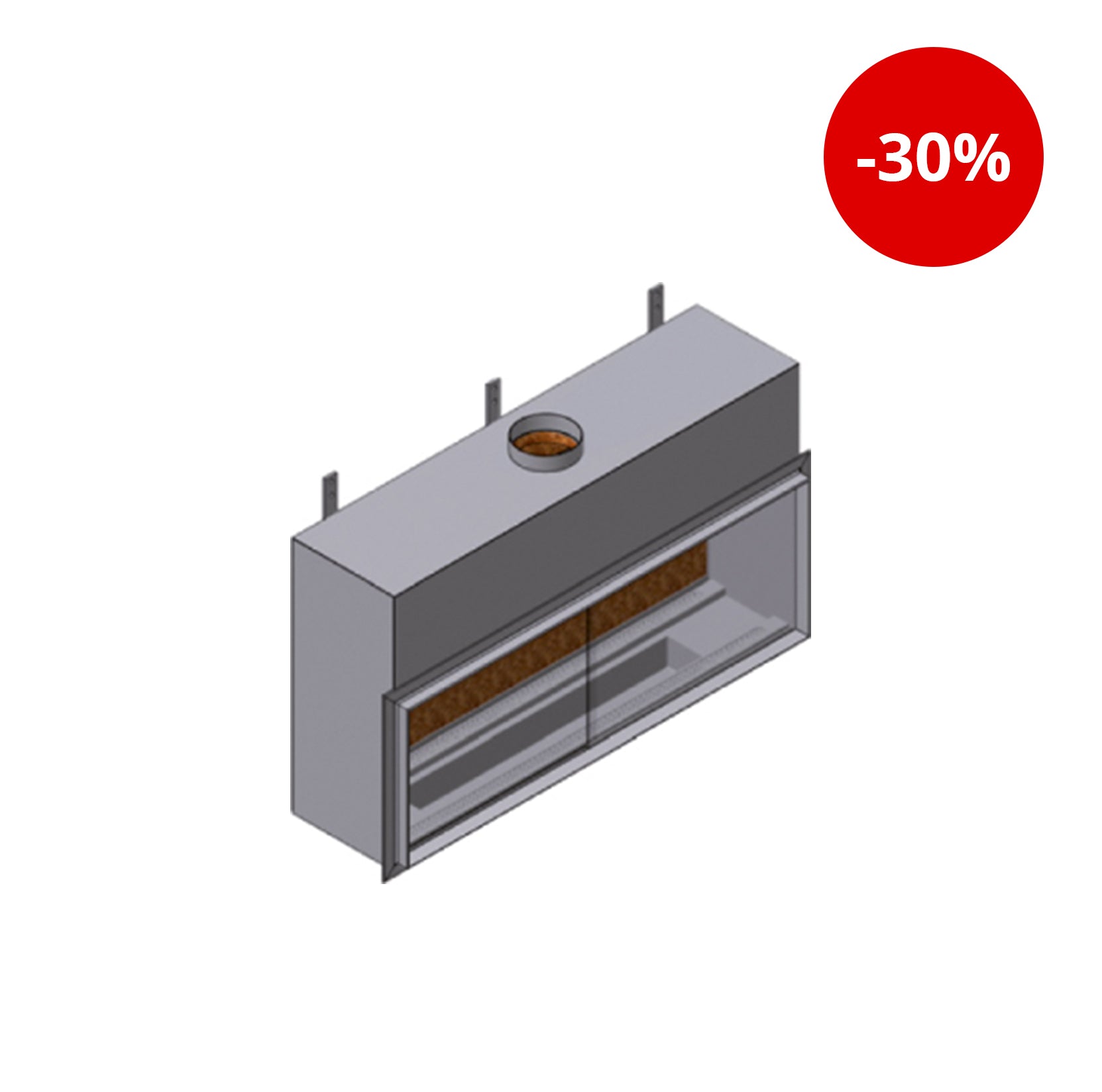 Mit Schiebeglastüren geschlossen, Rückwand Schwarz matt, Lufteinlassöffnungen am Feuerraumboden und regelbarer Abluftklappe zur optimalen Einstellung der Flammengröße bzw. des Flammenbildes. Inklusive Anschlusstutzen (ø160 mm) für Abluftklappe und obligatorischen Abluftkanal nach oben zur individuellen Abluftführung in den Raum, nach Außen, in einen Rauchfang usw.